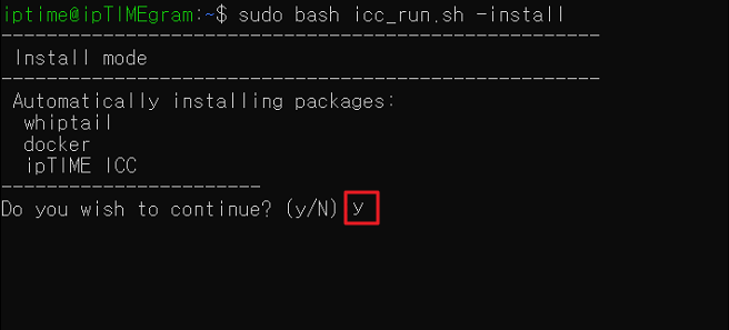 - ICC 설치를 위한 필요한 패키지들이 자동으로 함께 설치됩니다: whiptail, docker, ipTIME ICC