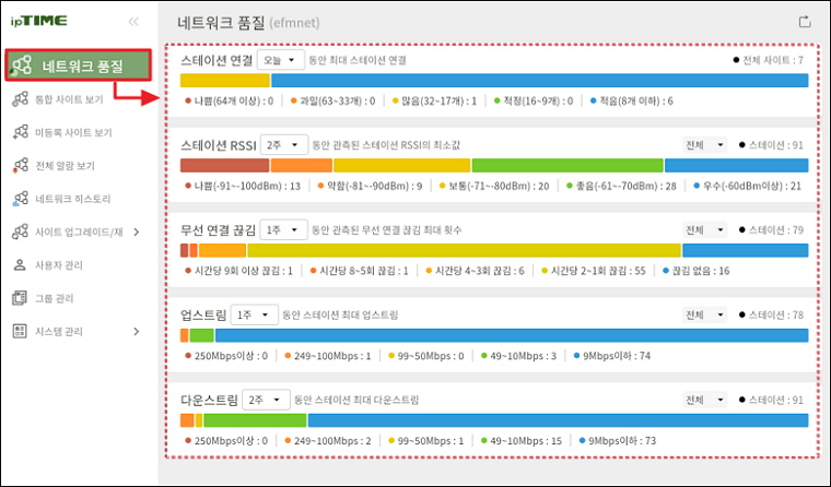 - 사이트별로 최대 스테이션 연결 수, 최소 RSSI, 최대 무선 끊김, 업/다운스트림 속도 등 주요 품질 데이터를 제공하며,