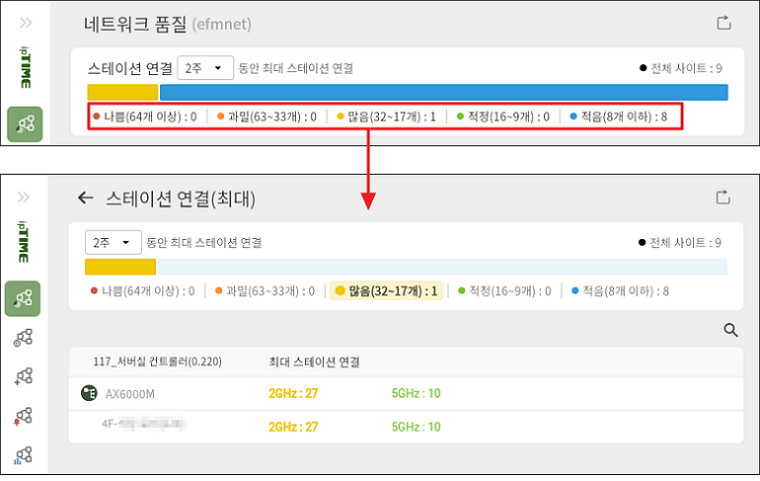 - 선택한 기간 동안 각 사이트에서 기록된 최대 스테이션 연결 수를 기준으로, 사이트를 ‘나쁨/과밀/많음/적정/적음’ 등급으로 분류하여