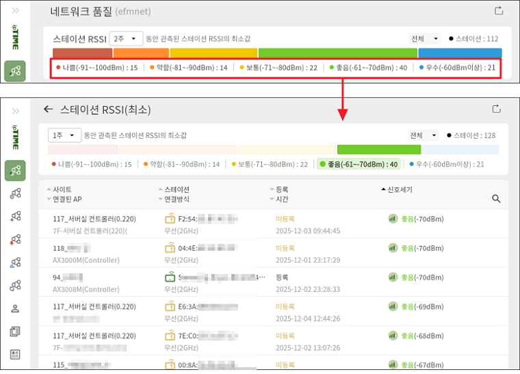 - 각 사이트에서 관측된 스테이션의 최소 RSSI 값을 기준으로, 스테이션을 ‘나쁨/약함/보통/좋음/우수’ 등급으로 분류하여 신호 품질이