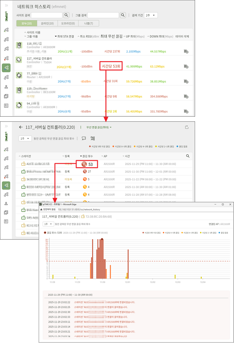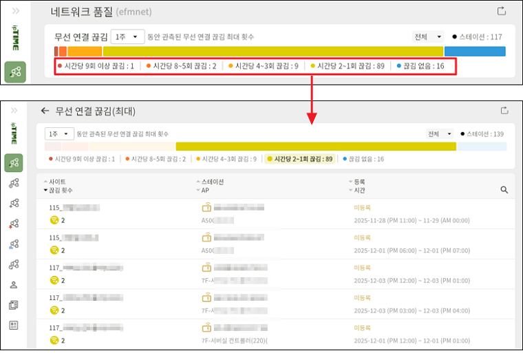 - 빈도 구간을 클릭하면 해당 범위에 속한 스테이션의 상세 정보를 확인할 수 있습니다. 무선 연결 끊김이 시간당 5회 이상 발생하는