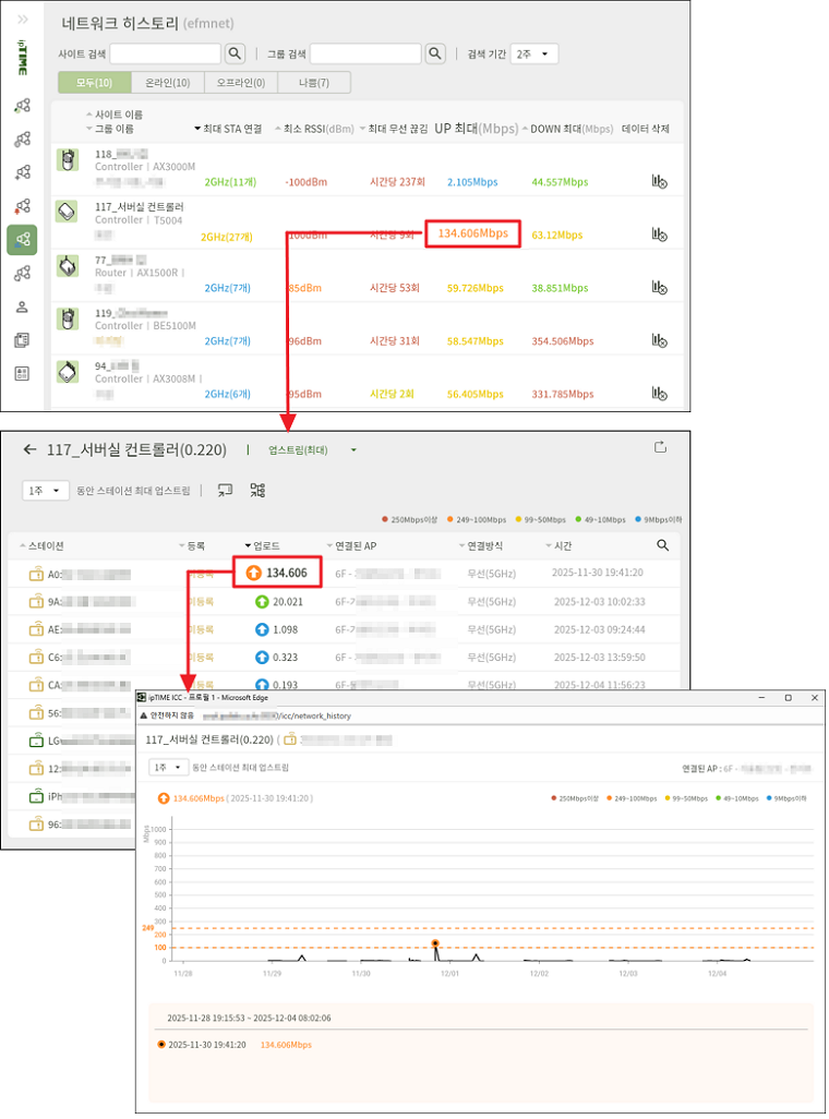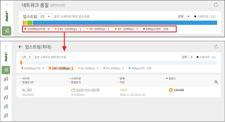 - 해당 항목을 클릭하면, 선택한 기간 동안 기록된 스테이션의 최대 업로드 속도 변화 추이를 그래프로 확인할 수 있습니다.