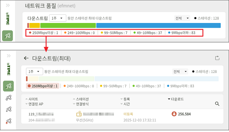 - 해당 항목을 클릭하면, 선택한 기간 동안 기록된 스테이션의 최대 다운로드 속도 변화 추이를 그래프로 확인할 수 있습니다.