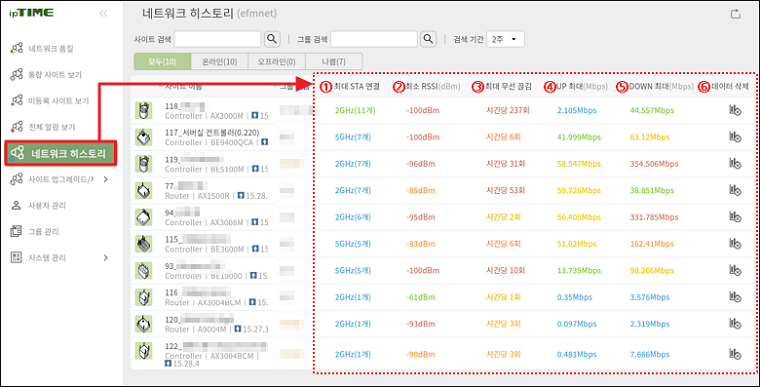 네트워크 품질, 네트워크 히스토리, 사이트 펌웨어 업그레이드 등 다양한 기능을 제공합니다.