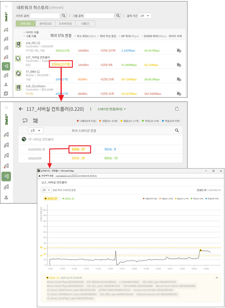 - 해당 항목을 클릭하면, 선택한 기간 동안 해당 대역에서 관측된 스테이션 연결 변화 추이를 그래프로 확인할 수 있으며,