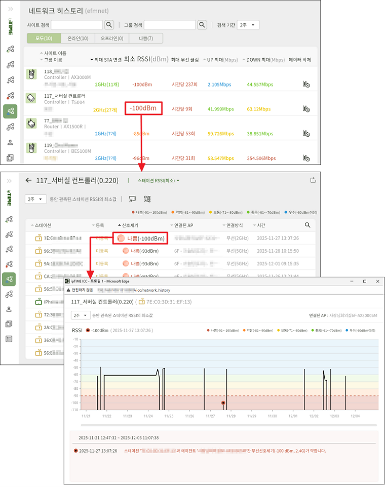 - 해당 항목을 클릭하면, 선택한 기간 동안 해당 대역에서 관측된 무선 신호세기(RSSI)의 변화이력을 그래프로 확인할 수 있습니다.