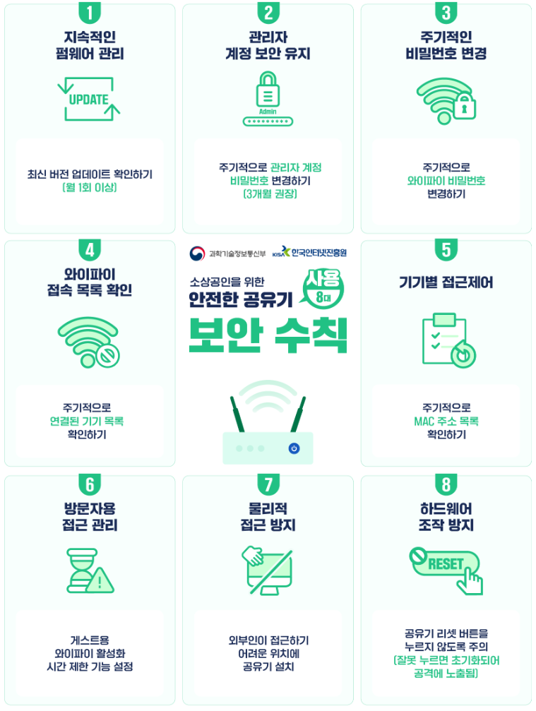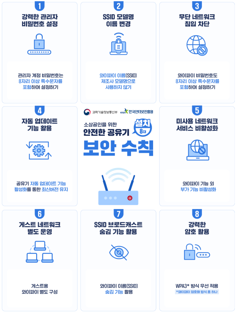 당사는 한국인터넷진흥원(KISA)의 공유기 관련 보안 권고사항을 준수하며, 지속적인 보안 패치를 지원합니다. 아래 KISA에서 배포한 공유기 사용 보안 수칙을 참고하여, 더욱 안전하게 공유기를 이용하시기 바랍니다. 1. 안전한 공유기 사용 보안 수칙 -설치 ipTIME 설치도우미 APP 또는 유틸리티를 이용하시면, KISA 권장 보안 수칙에 따른 안전한 공유기 설치가 가능합니다. 2. 안전한 공유기 사용 보안수칙- 사용 ipTIME 보안검사기를 이용하시면, KISA 권장 수칙에 따라 공유기를 보다 안전하게 관리할 수 있습니다.