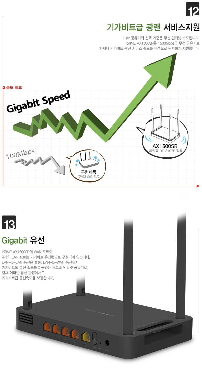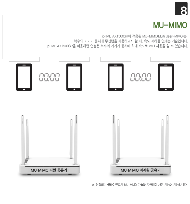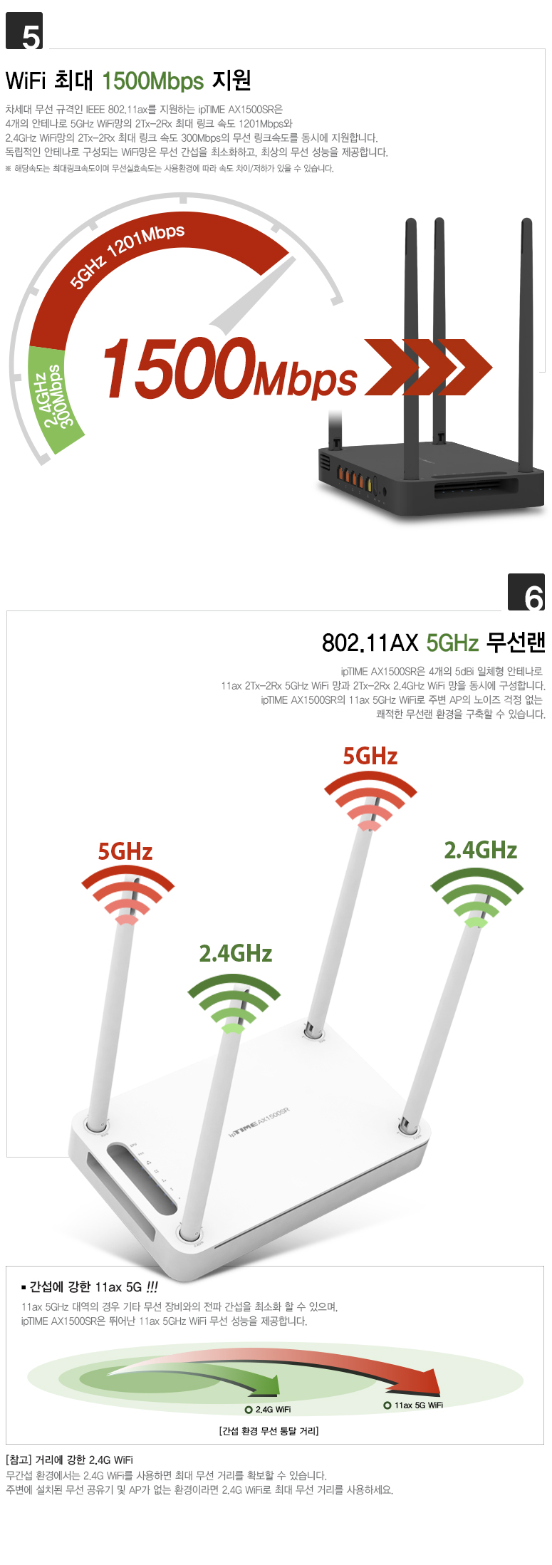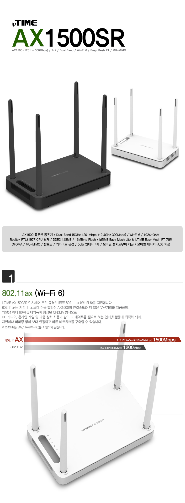 ipTIME AX1500SR은 802.11ax는 물론이고 802.11ac와 802.11abgn 모두를 지원하여
