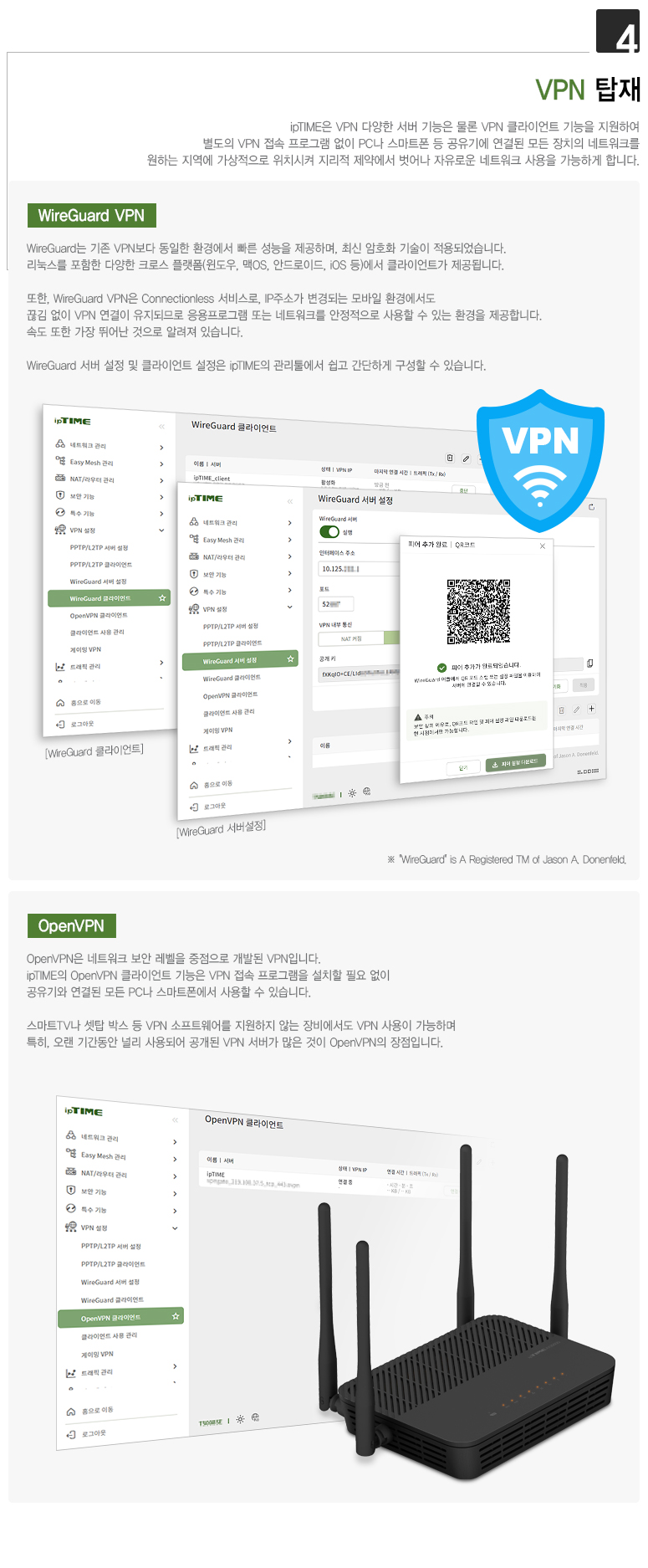 ipTIME의 VPN은 PPTP, L2TP 클라이언트를 지원하며, OpenVPN과 WireGuard VPN 서버 및 클라이언트를 지원합니다.