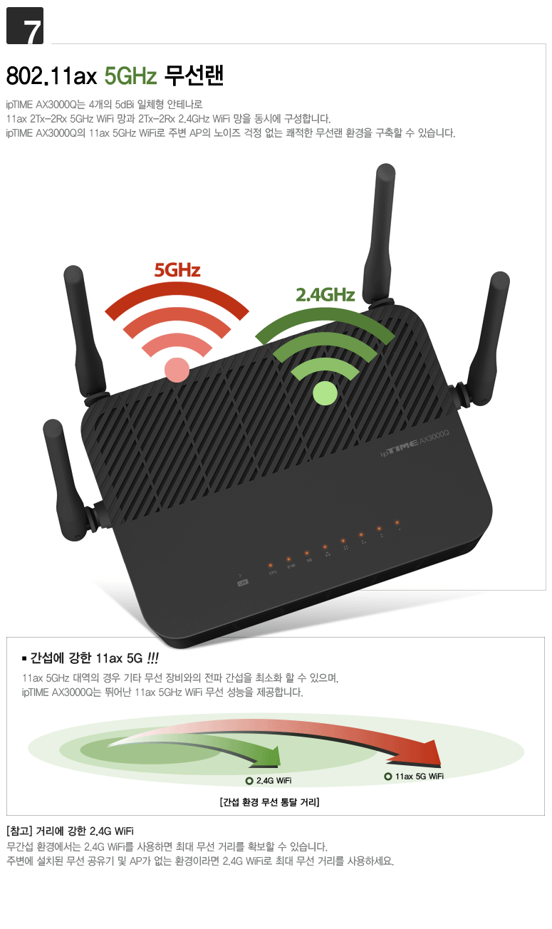 (5GHz는 2.4GHz에 비하여 장애물 및 거리에 따른 속도 저하에 민감합니다.)